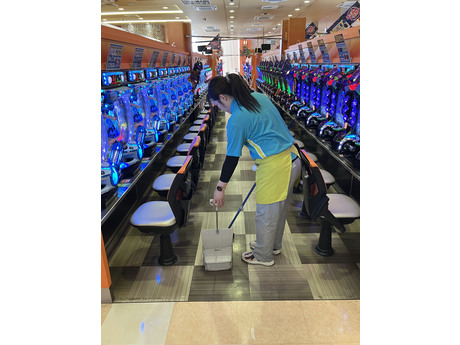 お客様の周囲や台間、通路、バックヤード、トイレ、店舗外周などの敷地内等の清掃が主な業務です。